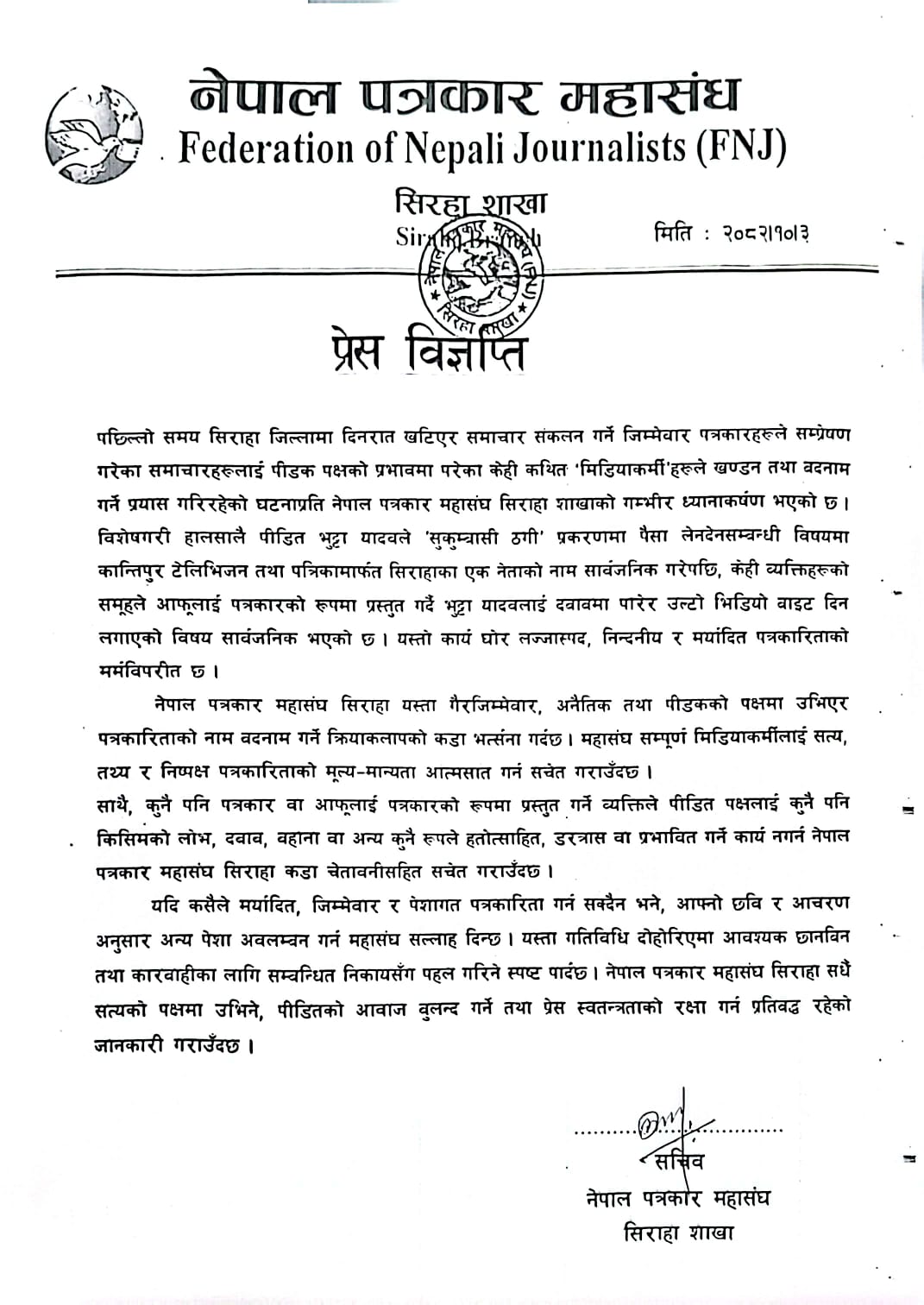 गैरजिम्मेवार पत्रकारिताविरुद्ध महासंघ सिरहाको कडा चेतावनी