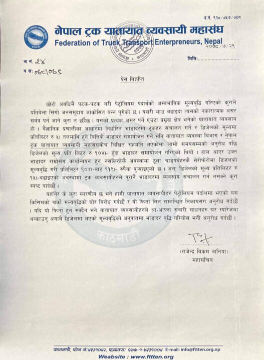 ठूला चाडपर्वहरूकै सेरोफेरोमा डिजलको मूल्य बढाएर प्रतिलिटर १०४ बाट ११९ रूपैयाँ पु¥याइएको र डिजेलको मूल्य प्रतिलिटर १५ रुपैयाँ बढाएको अवस्थामा ट्रक व्यवसायीहरूले पुरानै भाडादरमा व्यवसाय संचालन गर्न नसक्ने जनाएका छन् ।