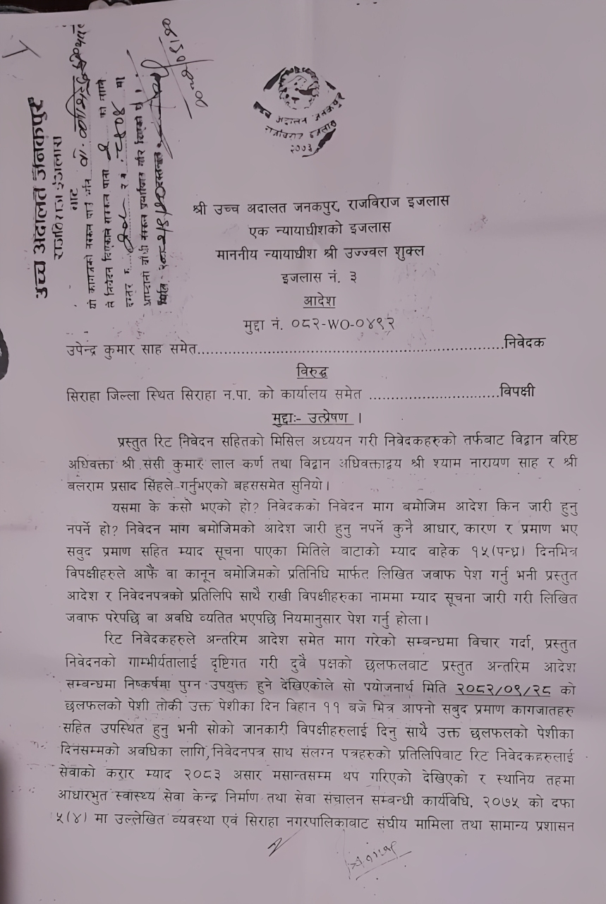 उच्च अदालत जनकपुरको राजविराज इजलासका न्यायाधीश उज्जवल शुक्लको इजलासले उपेन्द्र कुमार साहले निवेदक दायर गरेको रिट निवेदनमाथि प्रारम्भिक सुनुवाइ गर्दै म्याद थप भई कार्यरत कर्मचारीलाई तत्काल नहटाउन अल्पकालीन अन्तरिम आदेश दिएको हो । साथै, अन्तरिम आदेश जारी गर्नु नपर्ने कारण भए १५ दिनभित्र प्रमाणसहित लिखित जवाफ पेश गर्न सिरहा नगरपालिकालाई आदेश दिएको छ ।