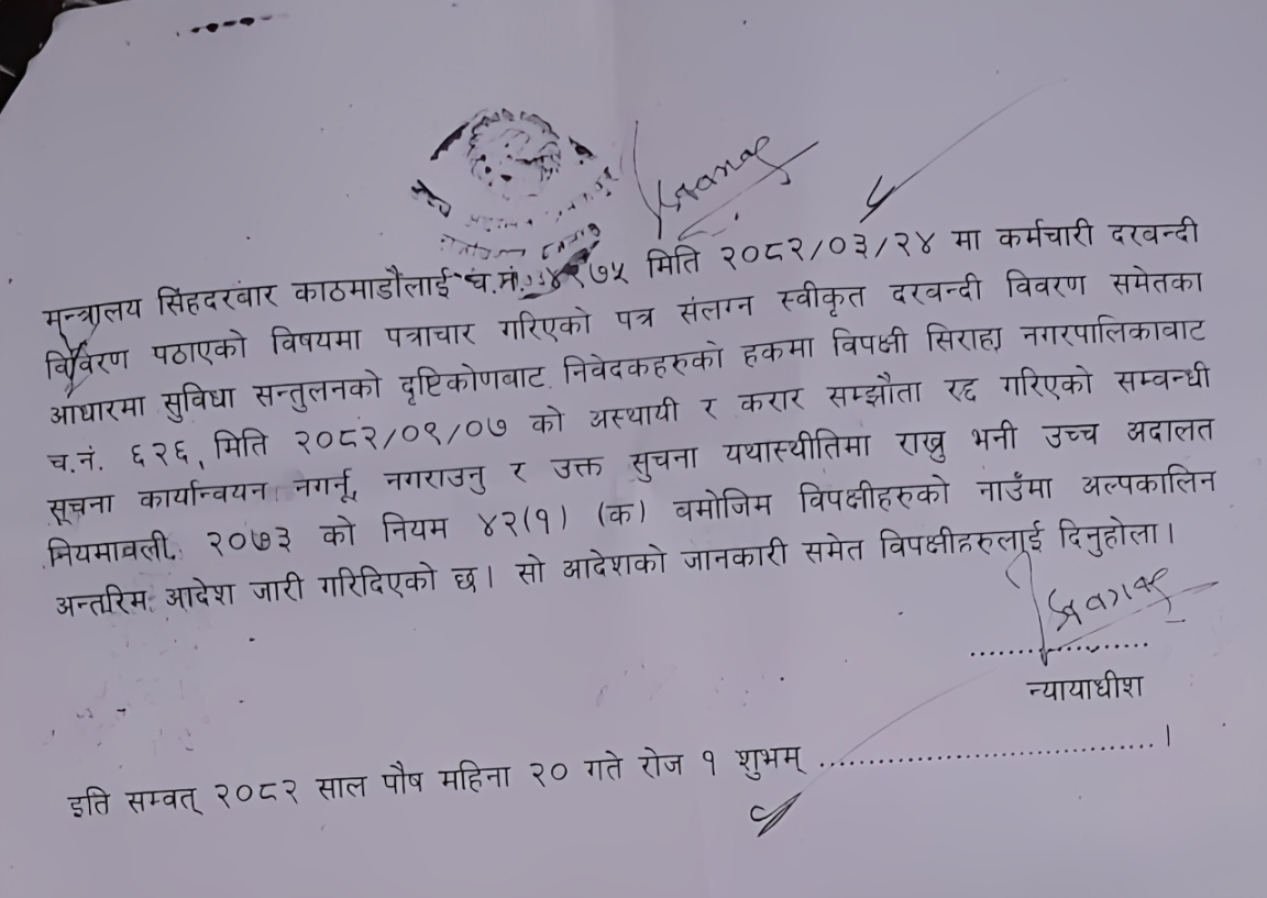 अदालतको आदेशपछि सिरहा नगरपालिकाको कर्मचारी व्यवस्थापनसम्बन्धी निर्णय हालका लागि कार्यान्वयनमा नआउने भएको छ । अब दुवै पक्षको लिखित जवाफ, प्रमाण र बहसपछि अदालतले अन्तिम फैसला सुनाउनेछ ।