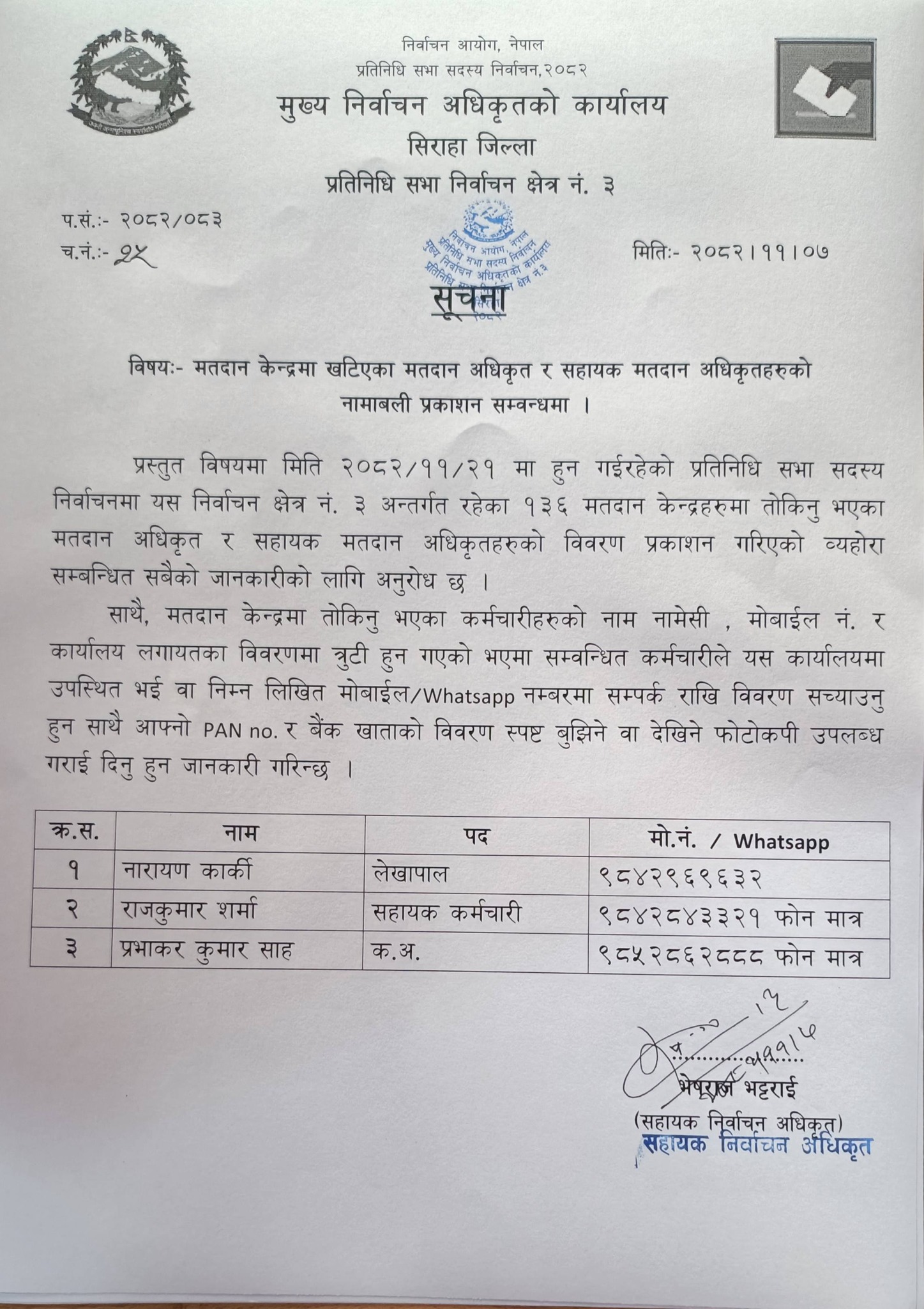 कार्यालयले जारी सूचनाअनुसार आगामी प्रतिनिधि सभा सदस्य निर्वाचनका लागि क्षेत्र नं. ३ अन्तर्गतका १३६ मतदान केन्द्रमा खटाइएका कर्मचारीहरूको विवरण प्रकाशन गरिएको हो।
