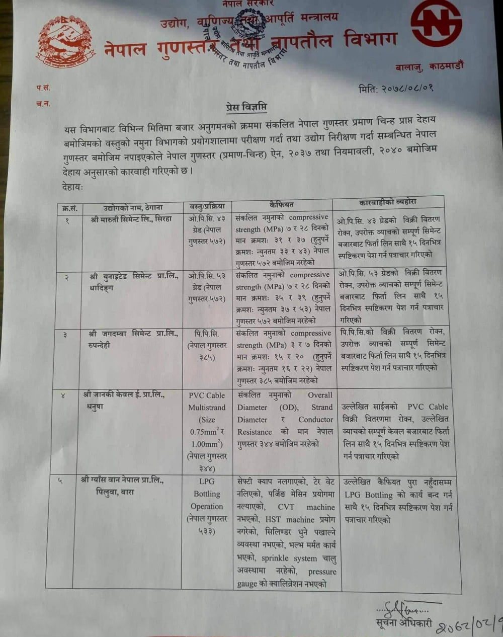मारुती, युनाइटेड र जगदम्बा सिमेन्ट प्रालिले उत्पादन गरेको सिमेन्टमा कम गुणस्तर पाइएको भन्दै विभागले १५ दिनभित्र स्पष्टीकरण दिन पत्राचार समेत गरेको छ । ती सिमेन्टको गुणस्तर परीक्षण गर्दा मापदण्ड अनुरुप गुणस्तर नभएकाले बिक्री वितरणमा रोक लगाउँदै स्पष्टीकरण सोधिएको नापतौल विभागले जनाएको छ ।