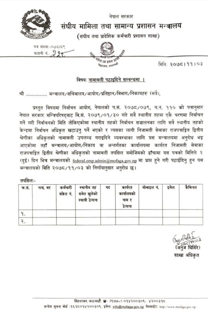 मन्त्रालयका शाखा अधिकृत अनुज घिमिरेका अनुसार सबै मन्त्रालय, सचिवालय, आयोग, प्रतिष्ठान, विभाग तथा निकायहरुसँग राजपत्राङ्कित द्वितीय श्रेणीका अधिकृतहरुको नामावली पठाउन निर्देशन दिएको हो ।