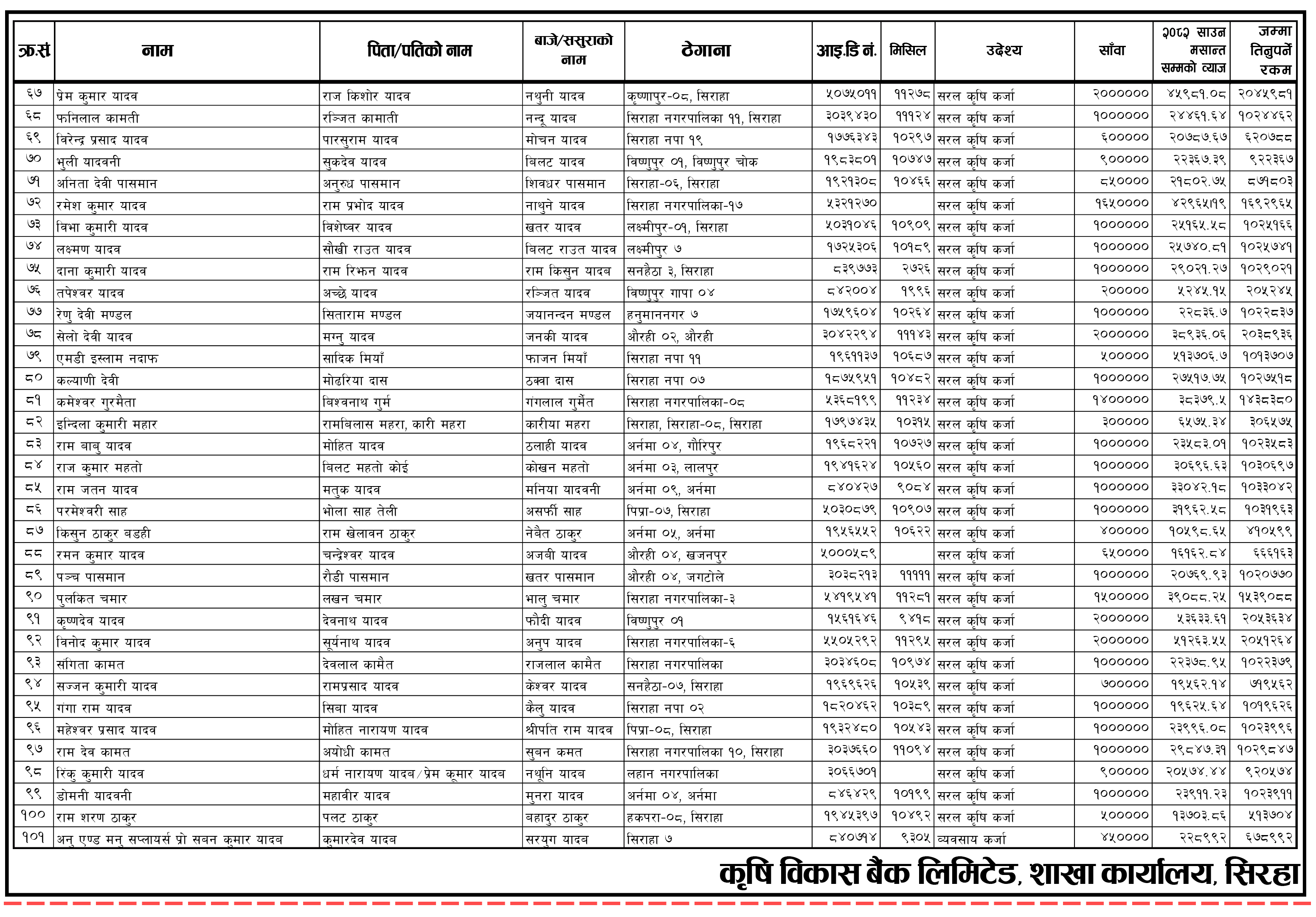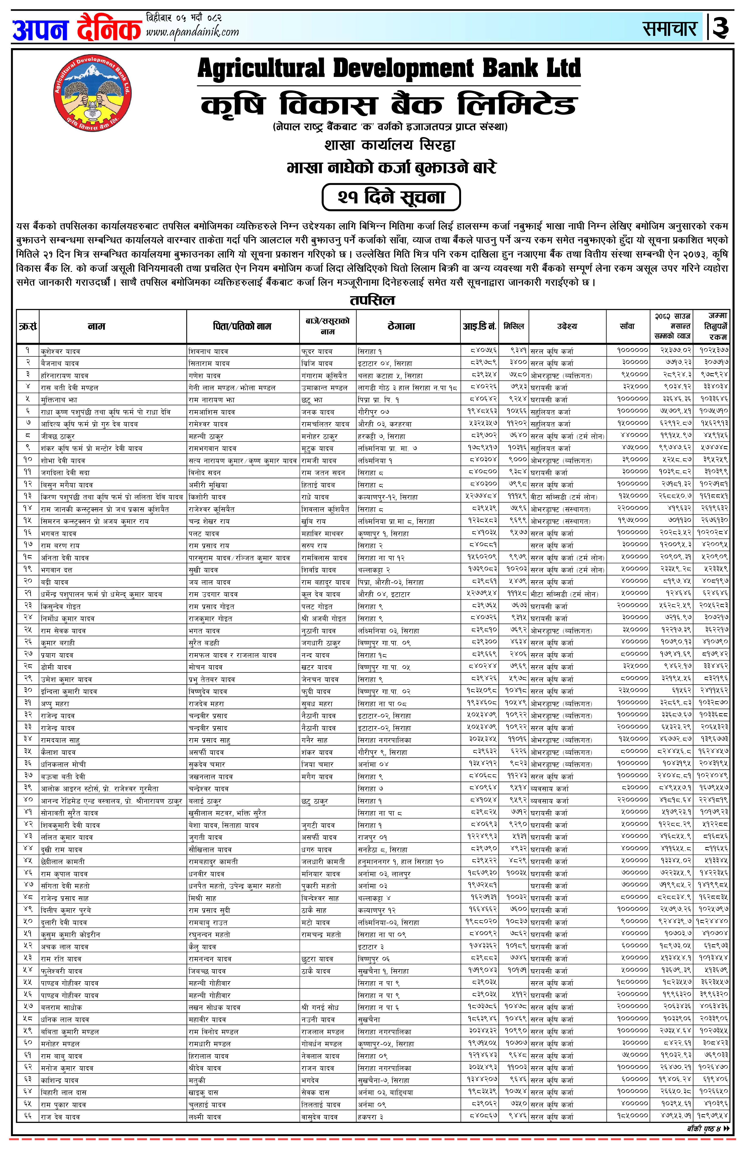 कृषि विकास बैंक लिमिटेड, शाखा कार्यालय सिरहा भाखा नाघेको कर्जा बुझाउने बारे (२०८२ भदाै ५ विहीवार)