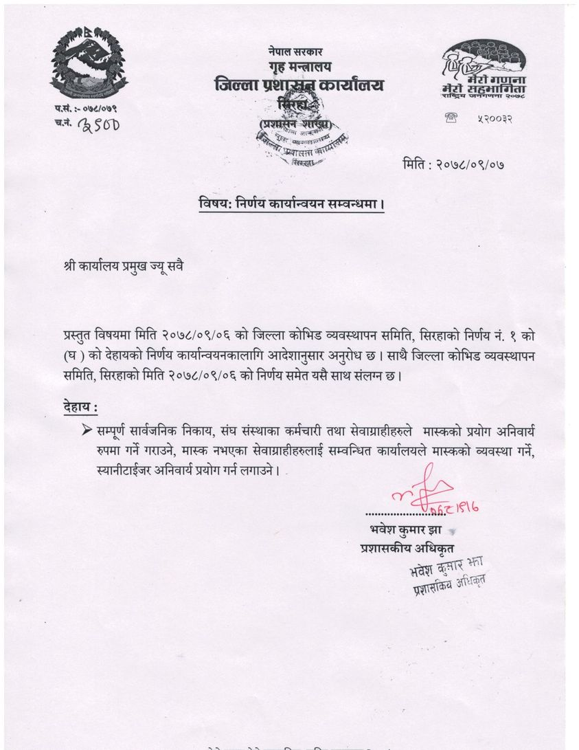 सिरहा । जिल्ला सहकारी संघ लिमिटेड सिरहाले रसायनिक मल आपूर्ति समितिले गरेको निर्णय अनुसार कृषि सामग्री कम्पनी लिमिटेड र साल्ट टे«डिग कर्पोरेशन लिमिटेडले निर्णय कार्यान्वयन नगरेको भन्दै प्रमुख जिल्ला अधिकारी लालबाबु कवारीलाई ज्ञापन पत्र बुझाएका छन् ।