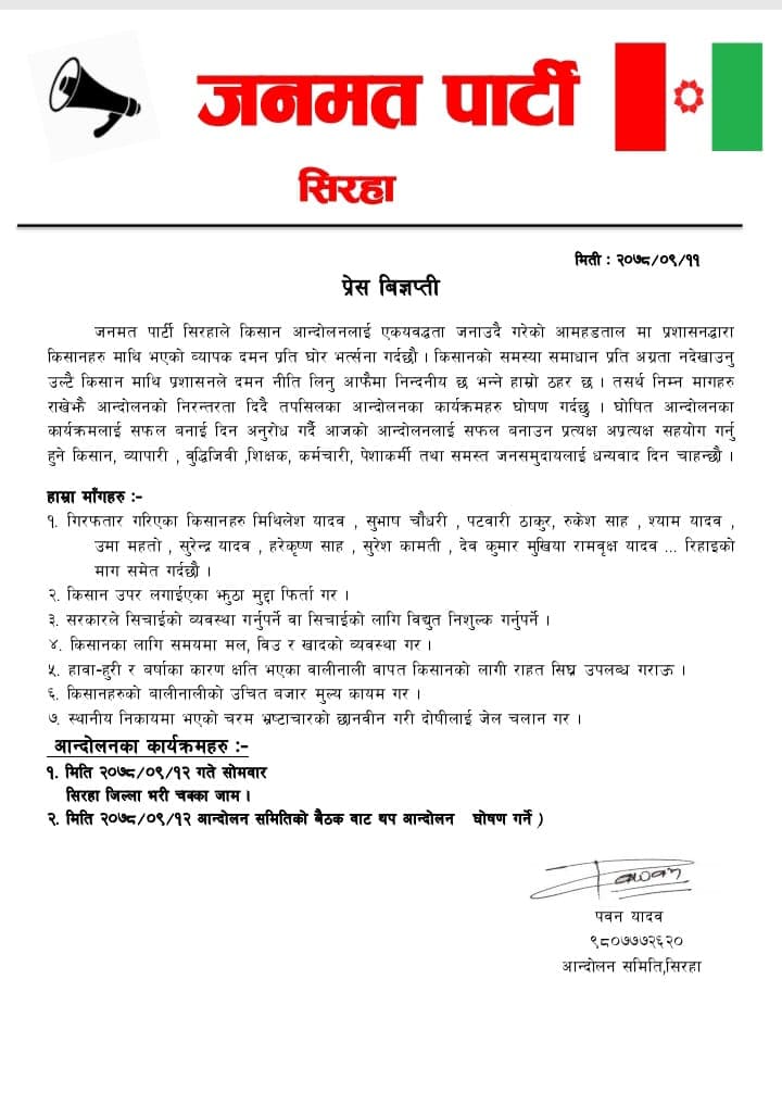 किसानको समस्या समाधान प्रति अग्रता नदेखाउनु उल्टै किसान माथि प्रशासनले दमन नीति लिनु आफैमा निन्दनीय छ- जनमत पार्टी आन्दोलन समितिले जारी गरेको विज्ञप्तीमा उल्लेख छ ।